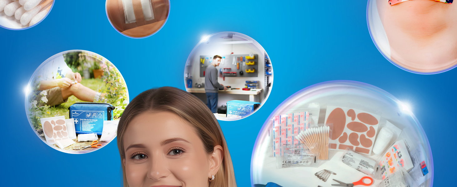 The set contains carefully selected first aid supplies with an extra large number of plasters. From children’s plasters with fun designs to classic plasters and wound dressings, as well as tweezers, scissors, and safety pins – everything you need is included. The robust, water-repellent bag reliably protects the contents and ensures a long service life.